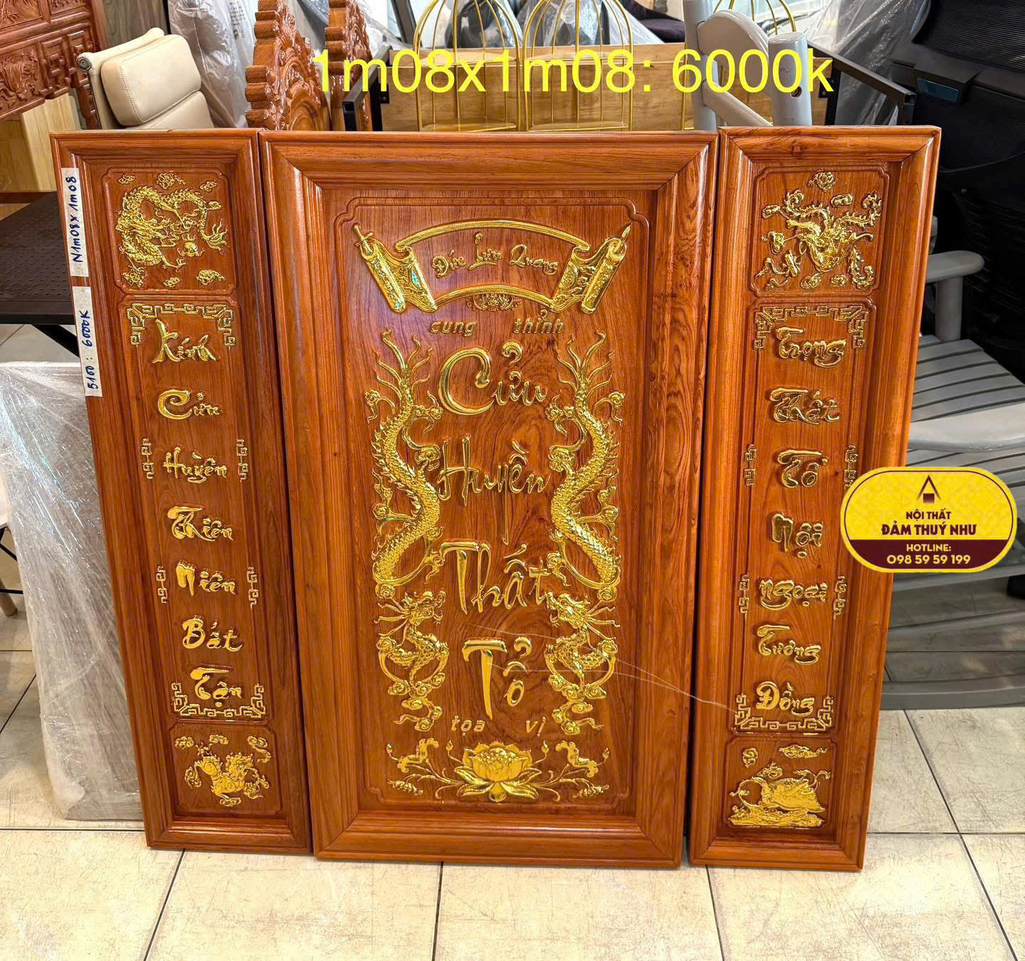 • Chất liệu: Gỗ hương được chạm khắc tinh xảo và phủ vàng nổi bật.
